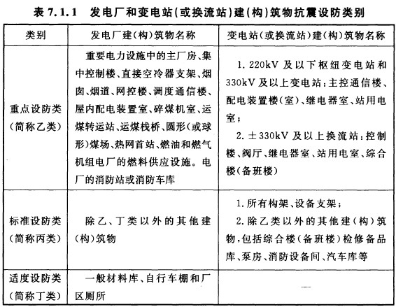 7.1.1 发电厂和变电站(或换流站)的建(构)筑物抗震设防类别应按表7.1.1确定,各设防类别建(构)筑物的抗震设防标准,均应符合现行国家标准《建筑工程抗震设防分类标准》GB 50223中3.0.3的要求。