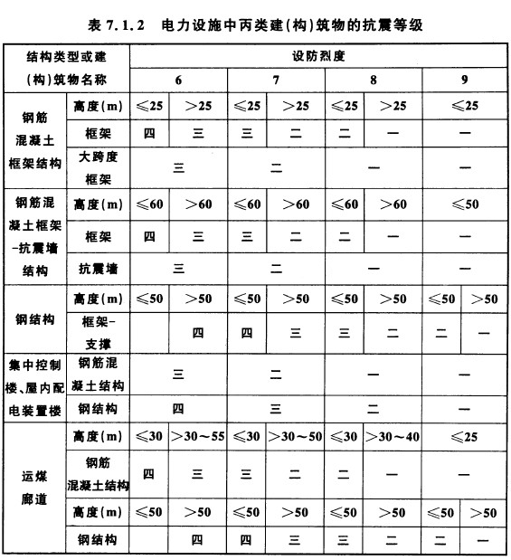 7.1.2 电力设施中的建(构)筑物应根据设防分类、烈度、结构类型和结构高度采用不同的抗震等级,并应符合相应的计算和构造措施要求。电力设施中丙类建筑的抗震等级应按表7.1.2确定。