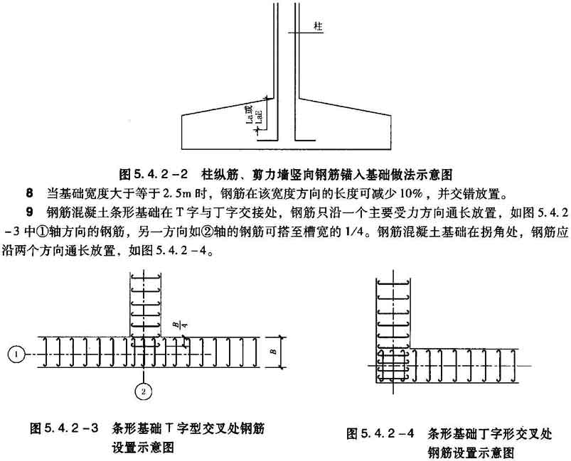 7 计算柱纵筋、剪力墙竖向钢筋锚入基础的长度la(有抗震要求时的锚固长度laE)应符合现行国家标准《混凝土结构设计规范》GB 50010的有关规定,见图5.4.2—2。因钢筋在基础中的混凝土保护层厚度大于钢筋直径的3倍且配有箍筋,根据现行国家标准《混凝土结构设计规范》GB 50010的有关规定其锚固长度可乘以修正系数0.8。