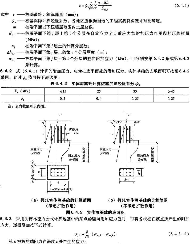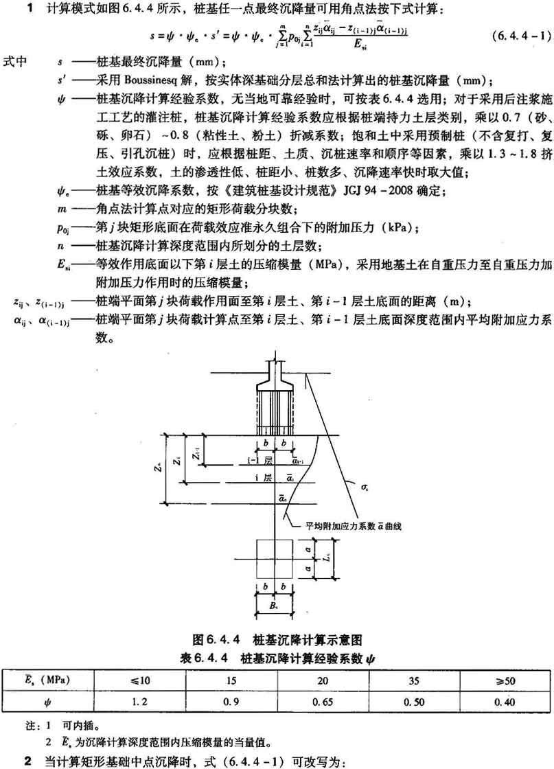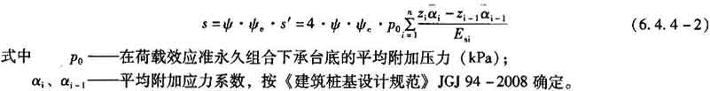 6.4.1 单向压缩分层总和法,桩基础最终沉降变形量的计算采用下式: