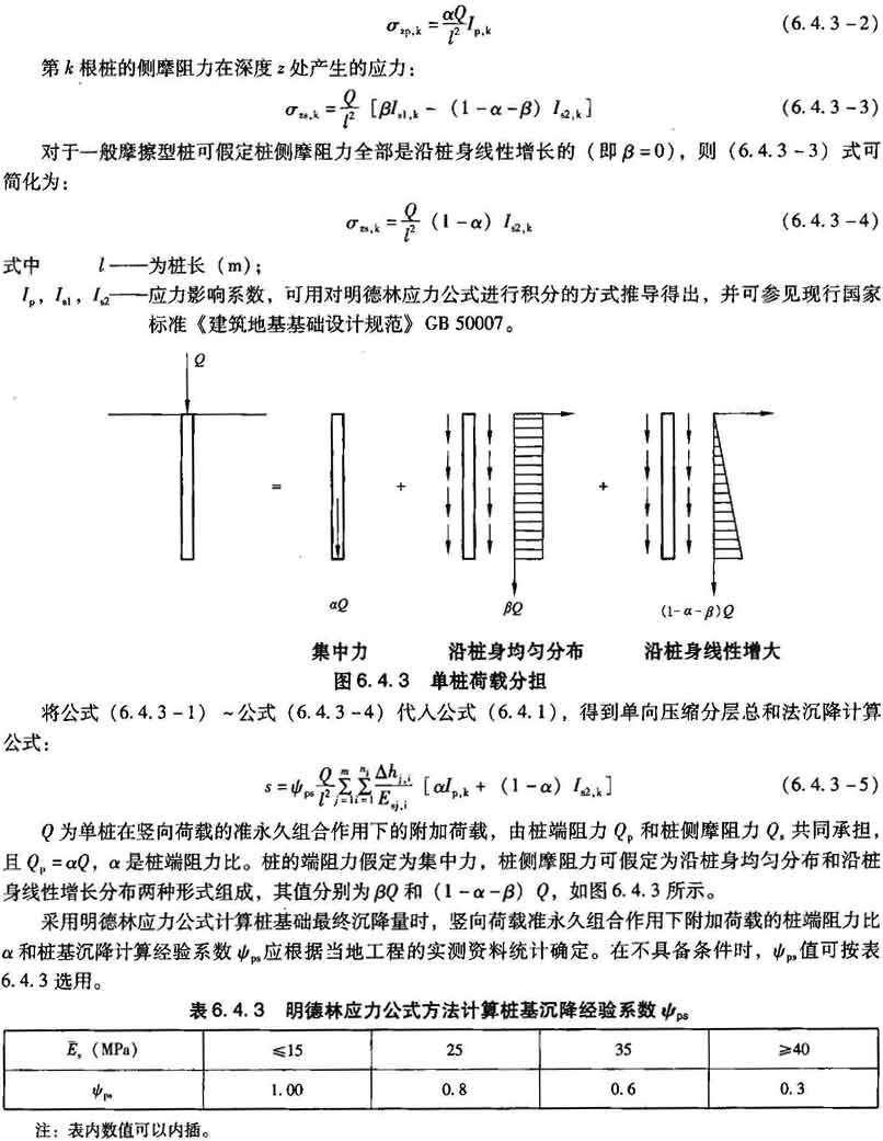 6.4.5 单桩、单排桩、疏桩基础和软土地基减沉复合疏桩基础的沉降计算见《建筑桩基技术规范》JGJ 94—2008。