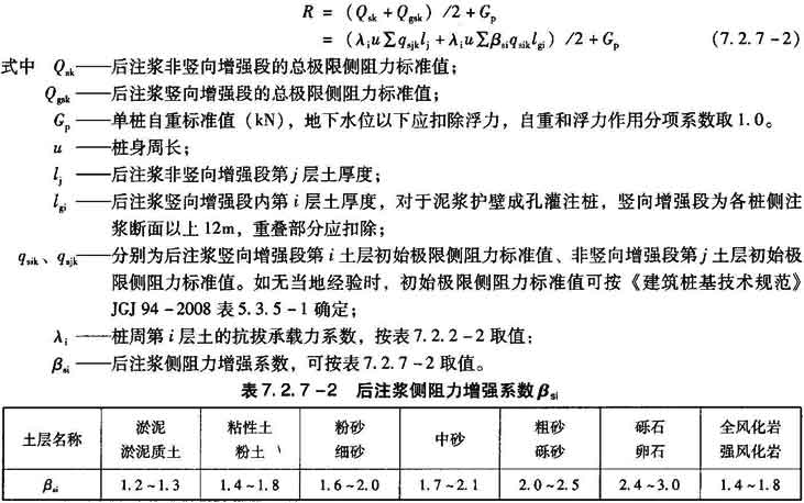 桩侧后注浆灌注桩的单桩极限抗拔承载力,应通过静载试验确定。在《建筑桩基技术规范》JGJ 94—2008第6.7节后注浆技术实施规定的条件下,后注浆单桩抗拔承载力特征值可按下式估算:
