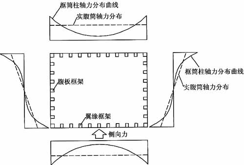 8.3.1 框筒结构是指建筑物周边由间距较密的框架柱(间距一般在4m左右)及有一定刚度的裙梁组成的筒体结构。此类结构可以有内筒,称为筒中筒结构。框筒结构是空间整截面工作的,在水平力作用下,不仅平行于水平力作用方向上的框架(腹板框架)起作用,而且垂直于水平力方向上的框架(翼缘框架)也共同受力。理想筒体在水平力作用下,截面保持平面,腹板应力直线分布,翼缘应力均布。但框筒结构虽然整体受力,却与理想筒体的受力有明显的差别,不再保持平截面变形,腹板框架柱的轴力是曲线分布的,翼缘框架柱的轴力也是不均匀分布,靠近角柱的柱子轴力大,远离角柱的柱子轴力小,这种应力分布不再保持直线规律的现象称为“剪力滞后”。