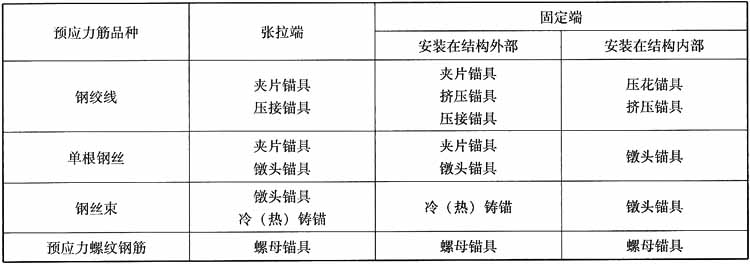 预应力筋锚具可分为夹片式、支承式、握裹式等;锚具选用应根据预应力筋品种、锚固部位、施工条件和张拉工艺确定;夹片式锚具不得用作预埋在混凝土内的固定端;压花锚具不得用于无粘结预应力钢绞线;承受低应力或动荷载的锚具应有防松装置。预应力筋锚具的选用可参照表11.2.1。