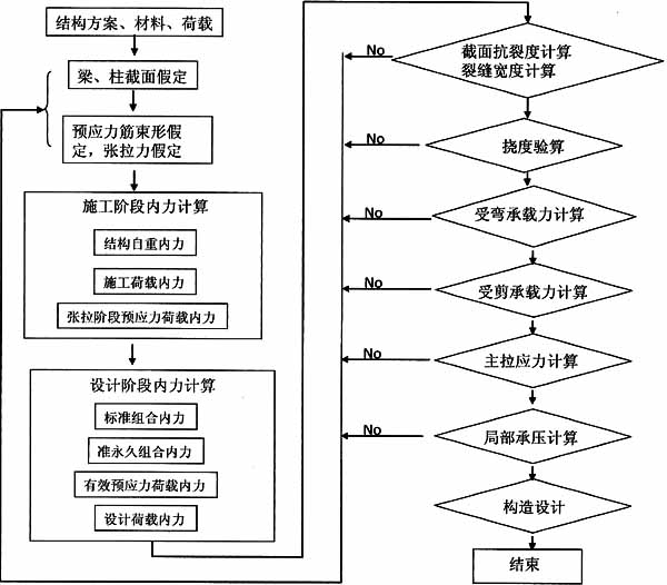 预应力混凝土结构设计和钢筋混凝土结构设计基本一致,包括结构方案确定、内力及变形计算分析、配筋及承载力验算、构造设计等内容。和钢筋混凝土结构设计相比,在结构计算阶段增加了预应力筋束形及张拉力假定的内容;在内力及变形计算阶段增加了预应力荷载作用下结构的内力计算;在配筋及承载力验算阶段增加了截面的抗裂度验算及主拉应力计算等内容,并增加了锚固区设计,对于超静定结构应考虑预应力次内力的影响;同时增加了构造设计的工作,构造设计包括预应力筋及锚具的排列、锚固区局部加强构造、张拉端及固定端的封闭构造等内容。预应力混凝土结构设计流程如下: