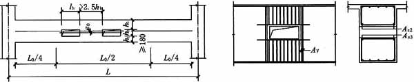 a 当矩形孔洞高度小于h/6及100mm,且孔洞长度小于h/3及200mm时,其孔洞周边配筋可按构造设置。弦杆纵筋As2、As3可采用210~212;弦杆箍筋采用6,间距不应大于0.5倍弦杆有效高度及100mm。垂直箍筋Av宜靠近孔洞边缘。
