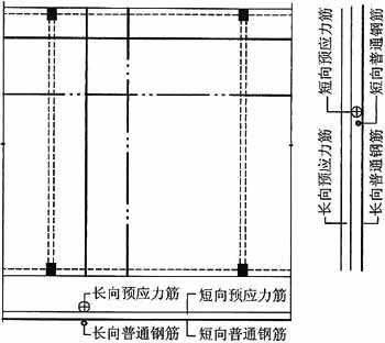 2)沿短跨的预应力筋在跨中宜布置在长跨预应力筋的下面,沿短跨的底部普通钢筋宜布置在长跨普通钢筋的上面。