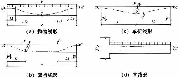 当梁(板)上荷载为均布线荷载时宜采用抛物线;有两处较大的集中荷载时宜采用双折线;有一处较大的集中荷载时宜采用单折线;悬挑梁(板)宜采用直线束,但在悬挑尖部预应力筋仍宜水平伸出。