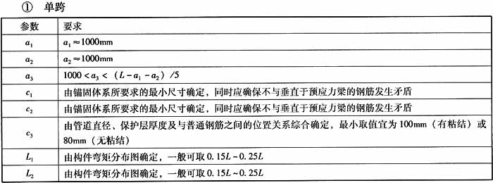 1)预应力筋宜采用双向多波连续抛物线布置,也可采用折线形布置。抛物线的参数取值应考虑双向普通钢筋及预应力筋交叉编网的影响。一般双向均沿板宽并筋均匀布置,也可单根均匀布筋,靠近板边缘处可适当减少。并筋布置时,每束预应力筋不宜超过4根,预应力束的间距不宜大于1200mm。
