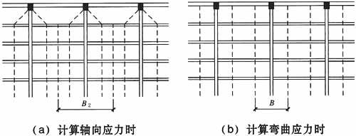 1)预应力筋在梁端部锚固时,预加力的轴向力在端部集中并沿梁跨度方向逐渐扩散,当计算预应力轴向力效应时,在端支座截面宜取梁宽,而在跨中或内支座截面翼缘宽度B2宜取板全宽;