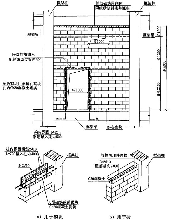 3 当填充墙的高度大于4m,宜在墙半高处或门窗洞顶设置混凝土配筋带,其截面高不小于100mm,钢筋不少于210,该钢筋应与两端的框架柱(含框剪)有可靠的锚固;