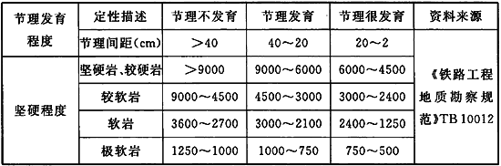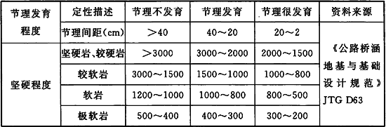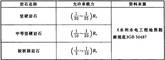 5.4.2 岩体作为工业与民用建筑物及公路与铁路桥涵等工程地基,其承载能力很高,一般都能满足设计要求。针对岩石地基的承载能力,目前国内外有关规范确定的地基承载力,大多以评估方法为主,有的主要利用岩石单轴抗压强度试验资料,并综合裂隙的发育程度及工程经验确定,总体偏于安全,见表14~表20。表14中,岩石地基的基本承载能力是指建筑物基础短边宽度不大于2.0m、埋置深度不大于3.0m时的地基容许承载力。地基容许承载力即是在保证地基稳定和建筑物沉降量不超过容许值的条件下,地基单位面积所能承受的最大压力。表15中,岩石地基的极限承载力是指地基岩土体即将破坏时单位面积所承受的压力。表16中,岩石地基承载力基本容许值是指基础短边宽度不大于2.0m、埋置深度不大于3.0m时,地基压力变形曲线上,在线性变形段内某一变形所对应的压力值,物理概念上也即是表14中的岩石地基的基本承载能力。