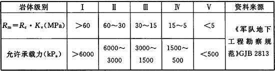 5.4.1 岩石地基工程主要是指以岩石作为承载地基的工业与民用建筑物岩石地基、公路与铁路桥涵岩石地基以及港口工程岩石地基等。岩石地基工程设计中,最关心的是地基的承载能力。由于岩体的基本质量综合反映了岩石的坚硬程度和岩体的完整程度,而此两项指标是影响岩石基础承载力的主要因素,因此,本条规定,岩石地基工程岩体的级别可以直接由岩体的基本质量定级。以往常采用岩石饱和单轴抗压强度Rc的折减来确定地基的承载力,本标准岩体基本质量则不仅考虑了Rc,还考虑了岩体的完整性,评价方法更为科学。