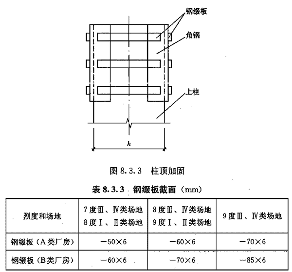 8.3.3 排架柱上柱柱顶采用钢构套加固时(见图8. 3.3),钢构套的长度不应小于600mm,且不应小于柱截面高度;角钢不应小于∟63×6,钢缀板截面可按表8.3,3采用。