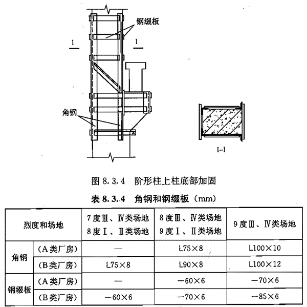 8.3.4 有吊车的阶形柱上柱底部采用钢构套加固时(见图8.3.4),钢构套上端应超过吊车梁顶面,且超过值不应小于柱截面高度;其角钢和钢缀板可按表8. 3.4采用。