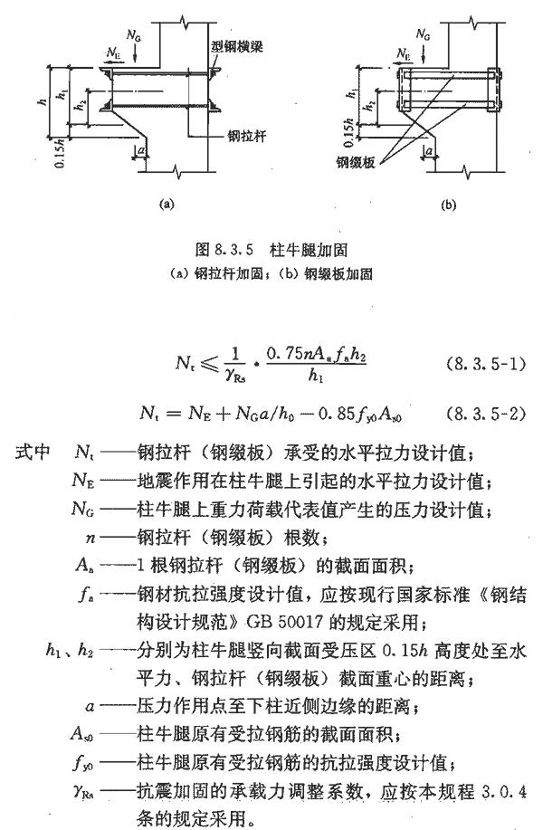 2 不符合上述条件且为8、9度时,钢缀板、钢拉杆的截面可按下列公式计算,钢横梁的截面面积可按钢拉杆截面面积的5倍采用。