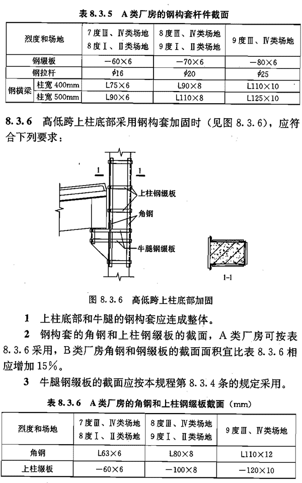 1 当厂房跨度不大于24m且屋面荷载不大于3.5kN/m2 时,钢缀板、钢拉杆和钢横梁的截面,A类厂房可按表8. 3.5采用,B类厂房可按表8.3.5增加15%采用。
