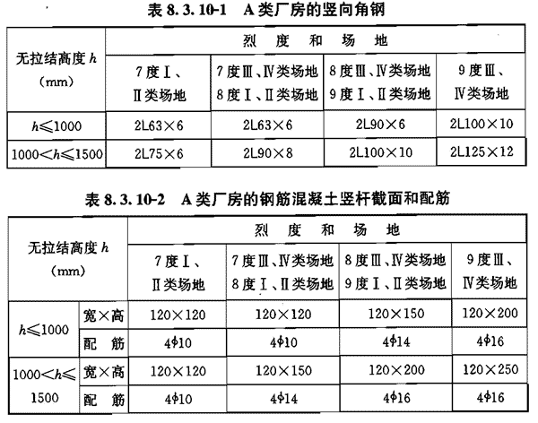 3 无拉结且高度不超过1.5m时,对A类厂房,竖向角钢可按表8.3. 10—1选用,钢筋混凝土竖杆可按表8.3. 10-2选用;对B类厂房,角钢和钢筋的截面面积宜相应增加15%。