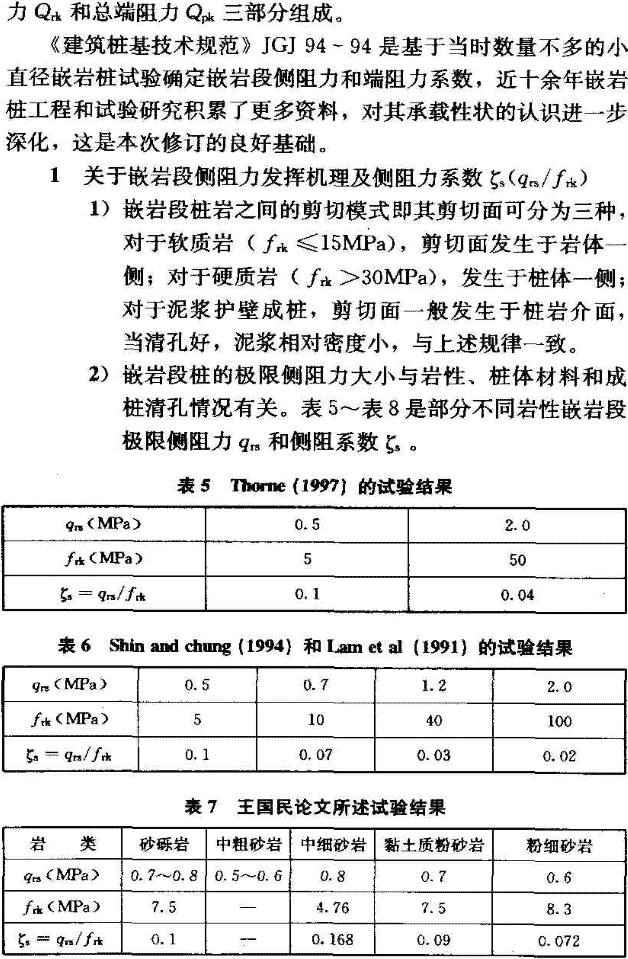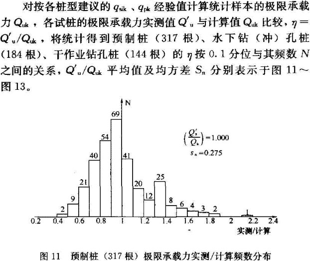 原《建筑桩基技术规范》JGJ 94-94收集的试桩资料经筛选得到完整资料229根,涵盖11个省市。本次修订又共收集试桩资料416根,其中预制桩资料88根,水下钻(冲)孔灌注桩资料184根,干作业钻孔灌注桩资料144根。前后合计总试桩数为645根。以原规范表列qsik、qpk为基础对新收集到的资料进行试算调整,其间还参考了上海、天津、浙江、福建、深圳等省市地方标准给出的经验值,最终得到本规范表5.3.5-1、表5.3.5-2所列各桩型的qsik、qpk经验值。