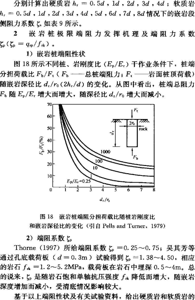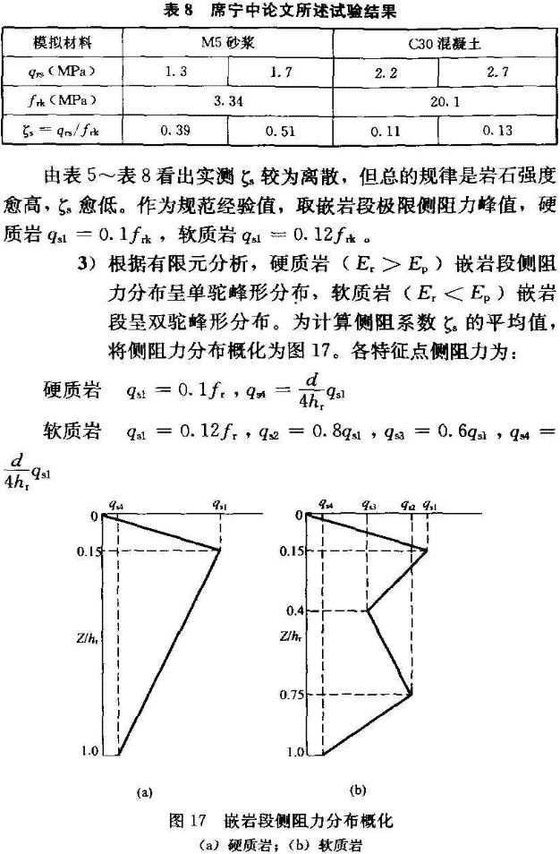 5.3.2 本条主旨是说明单桩竖向极限承载力标准值及其参数包括侧阻力、端阻力以及嵌岩桩嵌岩段的侧阻力、端阻力如何根据具体情况通过试验直接测定,并建立承载力参数与土层物性指标、静探等原位测试指标的相关关系以及岩石侧阻、端阻与饱和单轴抗压强度等的相关关系。直径为0.3m的嵌岩短墩试验,具嵌岩探匹根据岩层软硬程度确定。