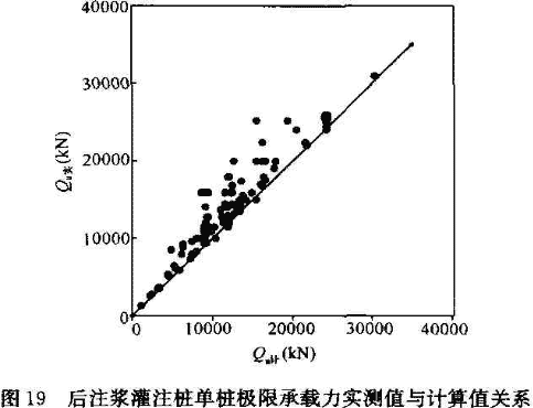 收集北京、上海、天津、河南、山东、西安、武汉、福州等城市后注浆灌注桩静载试桩资料106份,根据本规范第5.3.10条的计算公式求得Qu计,其中qsik、qpk取勘察报告提供的经验值或本规范所列经验值;增强系数βsi、βp取本规范表5.3.10所列上限值。计算值Qu计与实测值Qu实散点图如图19所示。该图显示,实测值均位于45°线以上,即均高于或接近于计算值。这说明后注浆灌注桩极限承载力按规范第5.3.10条计算的可靠性是较高的。